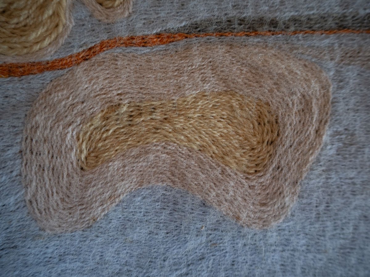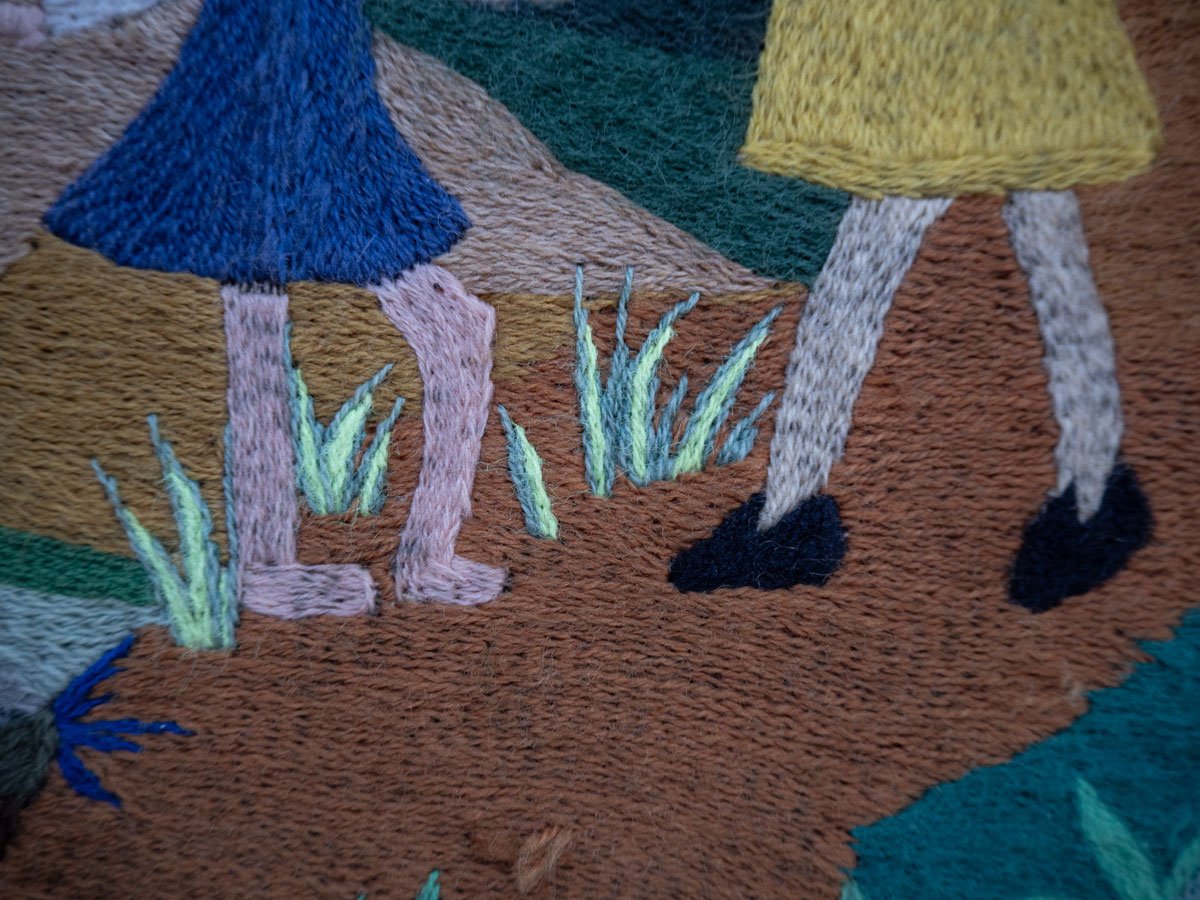 Fragmented Landscape (2024) weaves themes of memory, resistance, and intergenerational craftsmanship. In 1973, at the onset of Augusto Pinochet’s military dictatorship in Chile, my grandmother, Irma Pulgar Campos (1921–2004), created Doñihue, 1973—an arpillera, or embroidered textile scene. She was an art teacher in a rural school in central Chile. She asked her students to draw elements or motifs that represented the locality of Doñihue. There is the dog of one of the students, a Chamanto -traditional poncho worn by Chilean huasos-, the hills with their sheep and their soil of different colors, there is a Loica bird, a lemon tree, the huge summer tomatoes, an apple tree and an orange tree, and children playing and collecting the summer harvest.