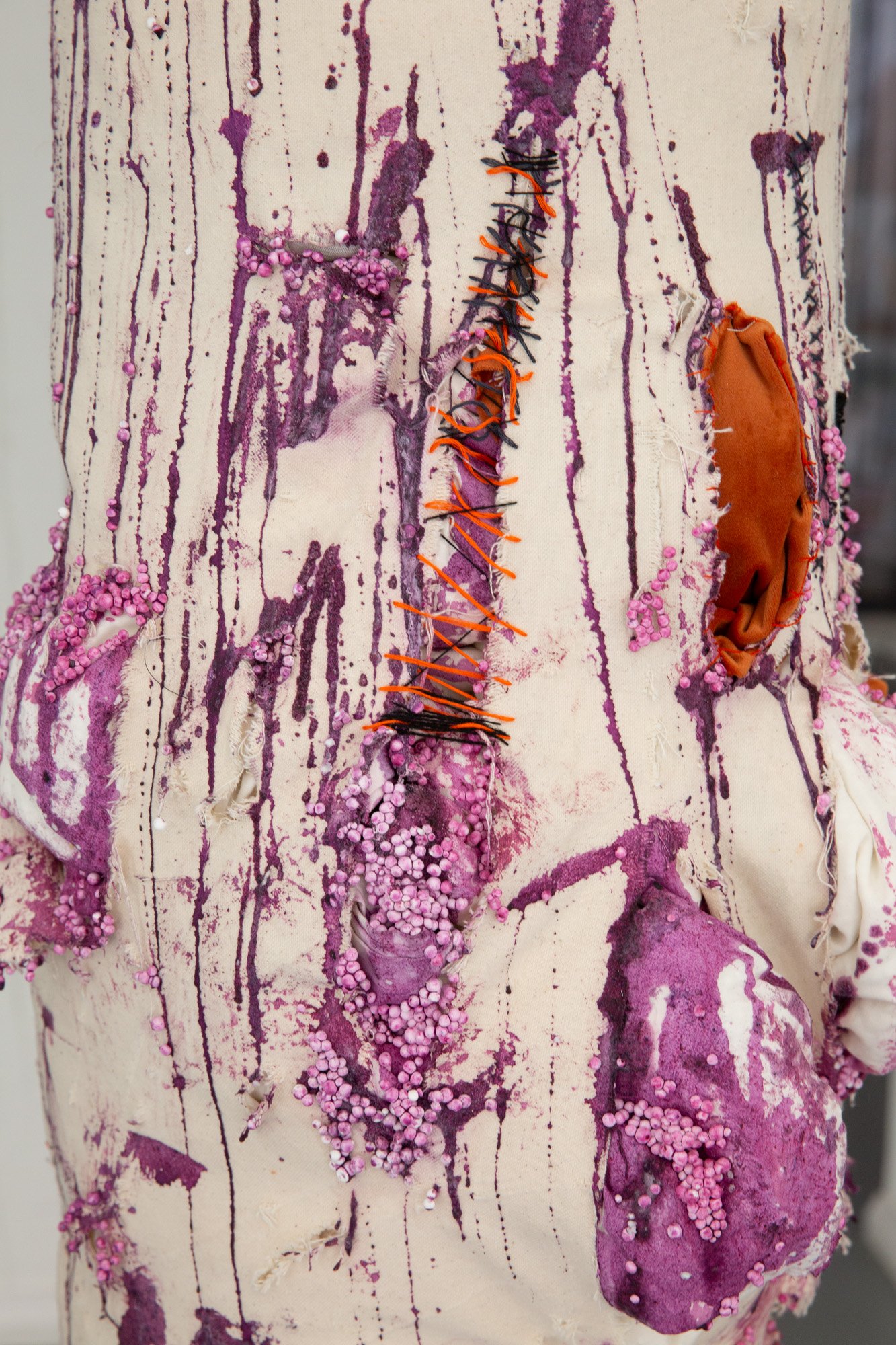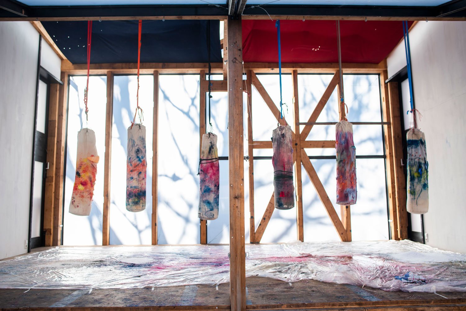 Boxing bags sewn from natural cotton canvas, thread, filling, pigments, cotton rope, leaf metal flakes, eyelets.