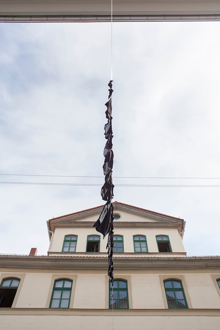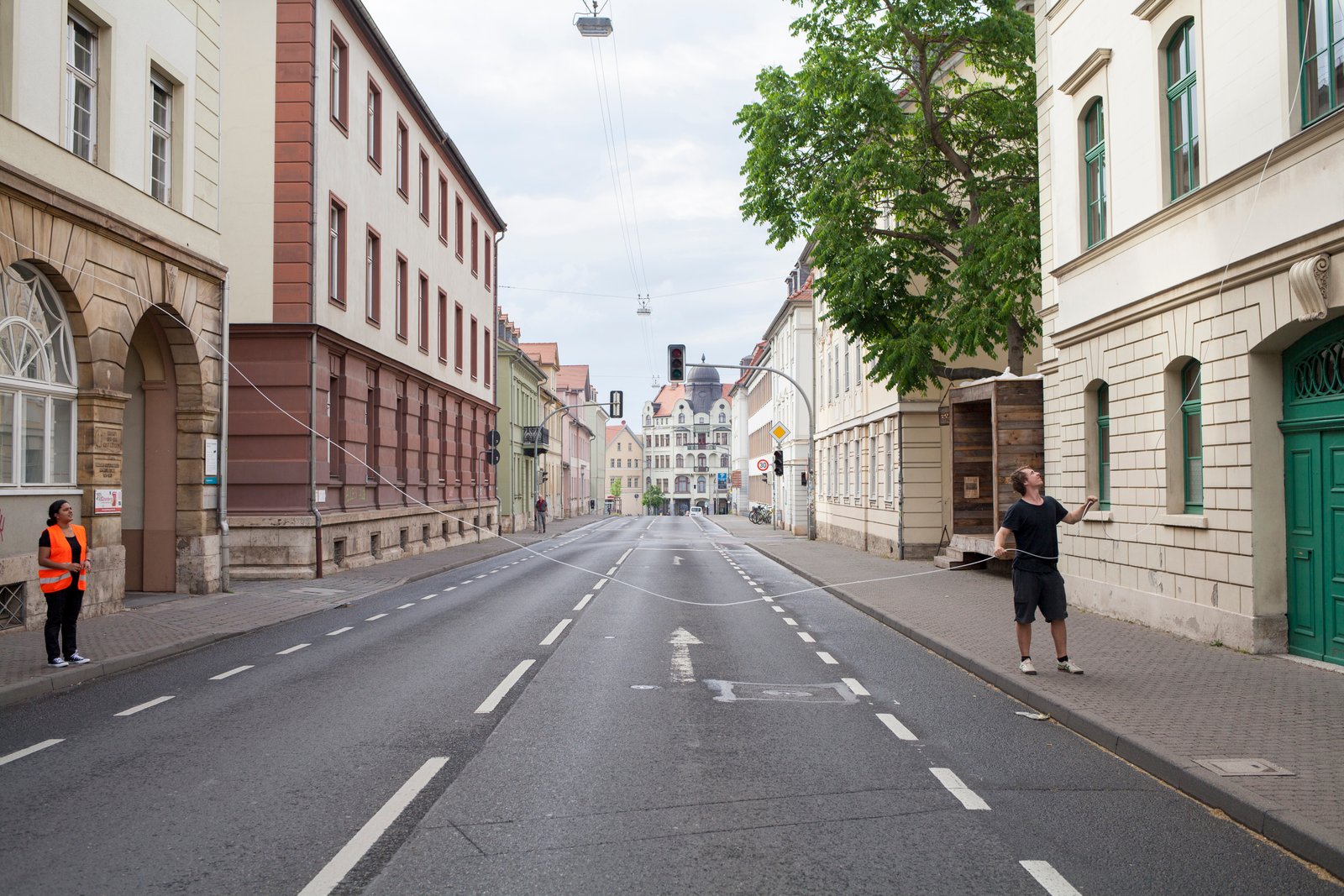 "One Line Portrait" is part of the research "Public Laundry, Hanging Territories". This project explores how the banal, when placed in a specific context, can become a symbolic expression of culture and its spatial-social practices. In June 2019, a clothesline was installed in the quiet cityscape of Weimar, portraying the presence of a different individual each day for one week.