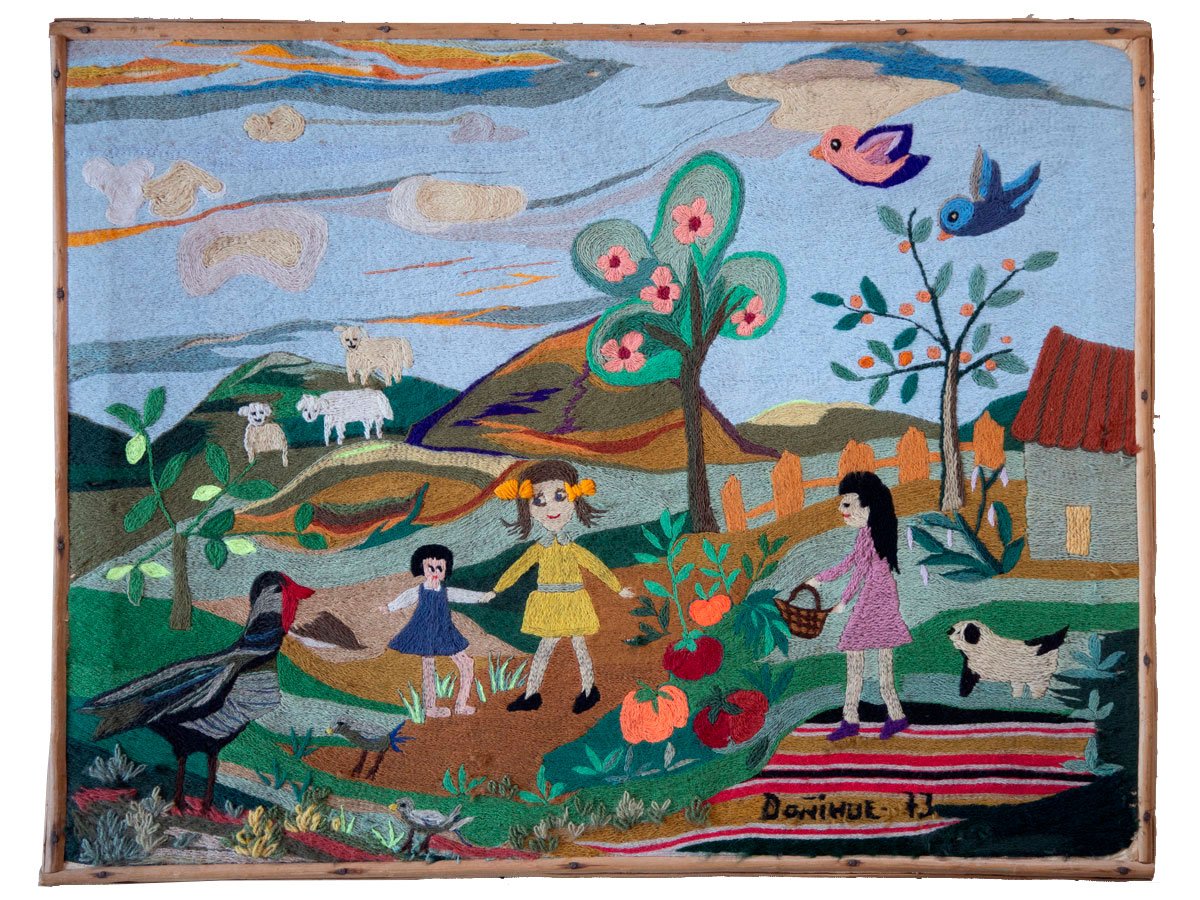 Arpillera embroidered cotton, wool, yute fabric, wooden frame.