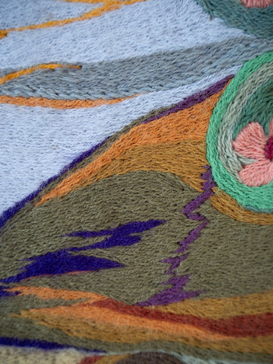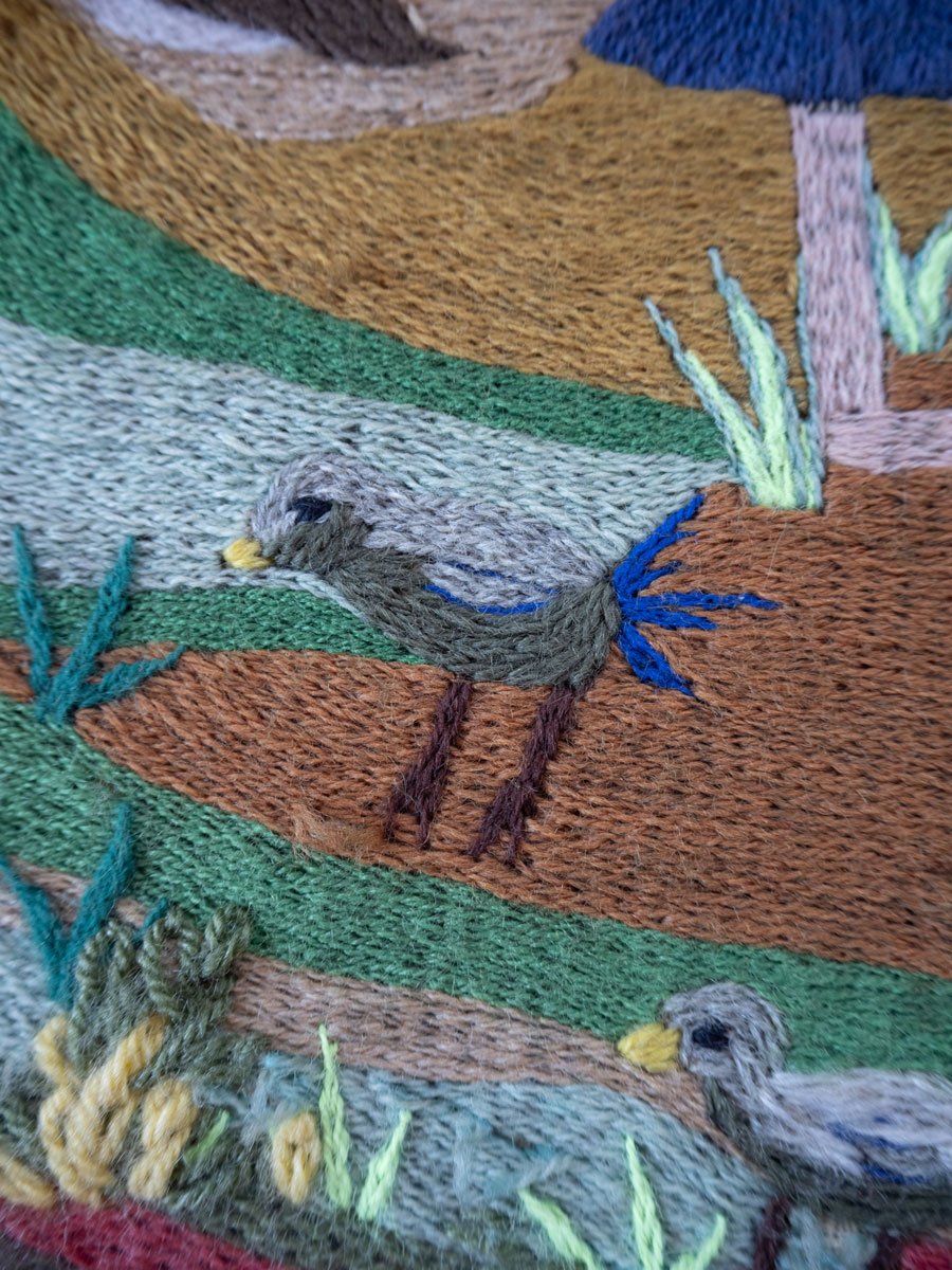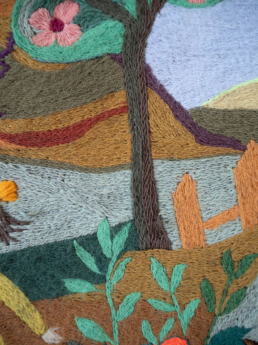 Fragmented Landscape (2024) weaves themes of memory, resistance, and intergenerational craftsmanship. In 1973, at the onset of Augusto Pinochet’s military dictatorship in Chile, my grandmother, Irma Pulgar Campos (1921–2004), created Doñihue, 1973—an arpillera, or embroidered textile scene. She was an art teacher in a rural school in central Chile. She asked her students to draw elements or motifs that represented the locality of Doñihue. There is the dog of one of the students, a Chamanto -traditional poncho worn by Chilean huasos-, the hills with their sheep and their soil of different colors, there is a Loica bird, a lemon tree, the huge summer tomatoes, an apple tree and an orange tree, and children playing and collecting the summer harvest.