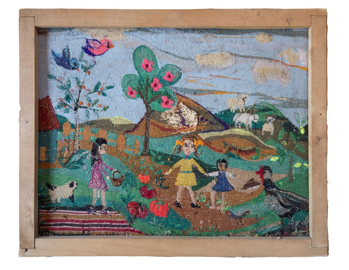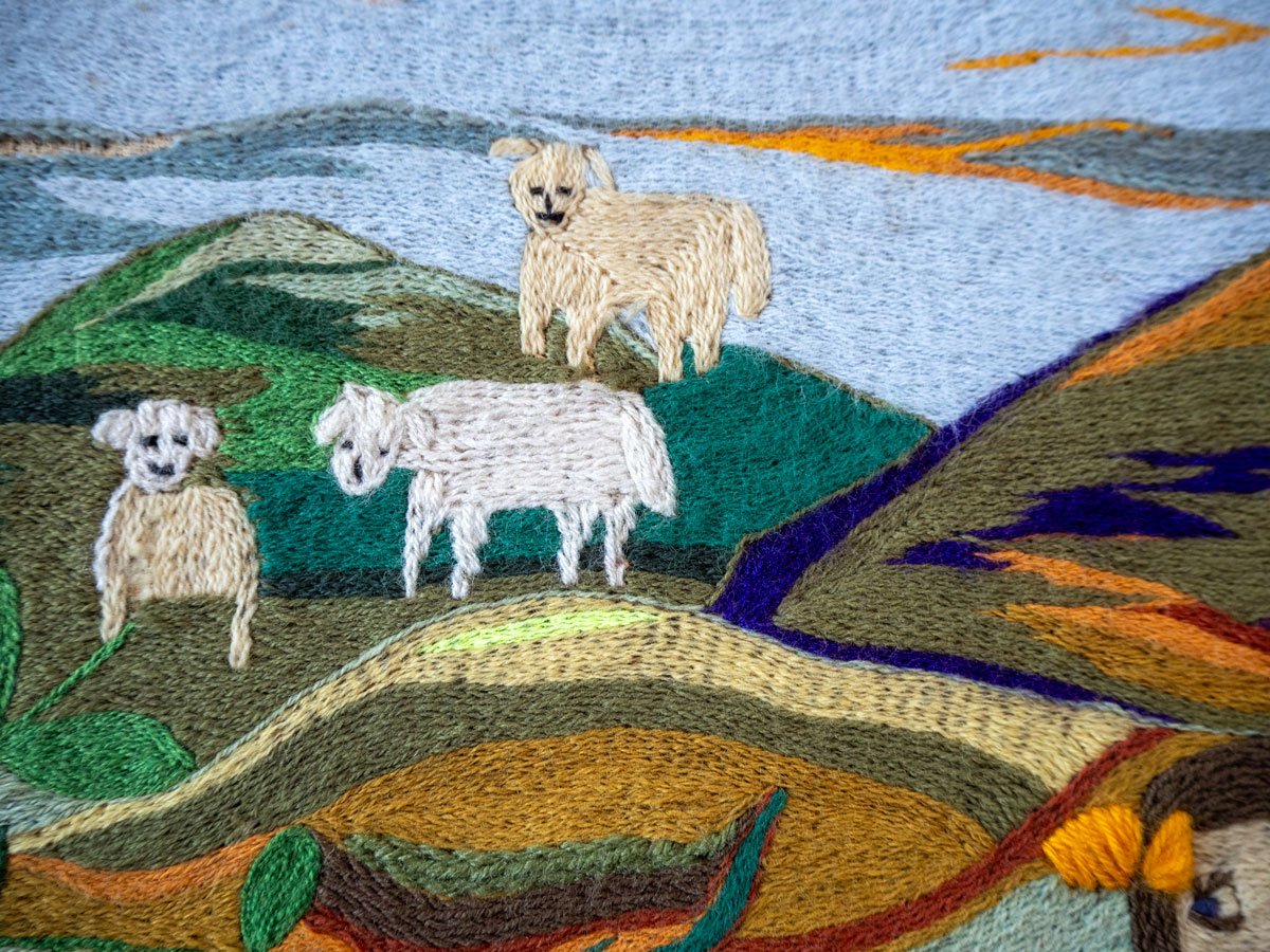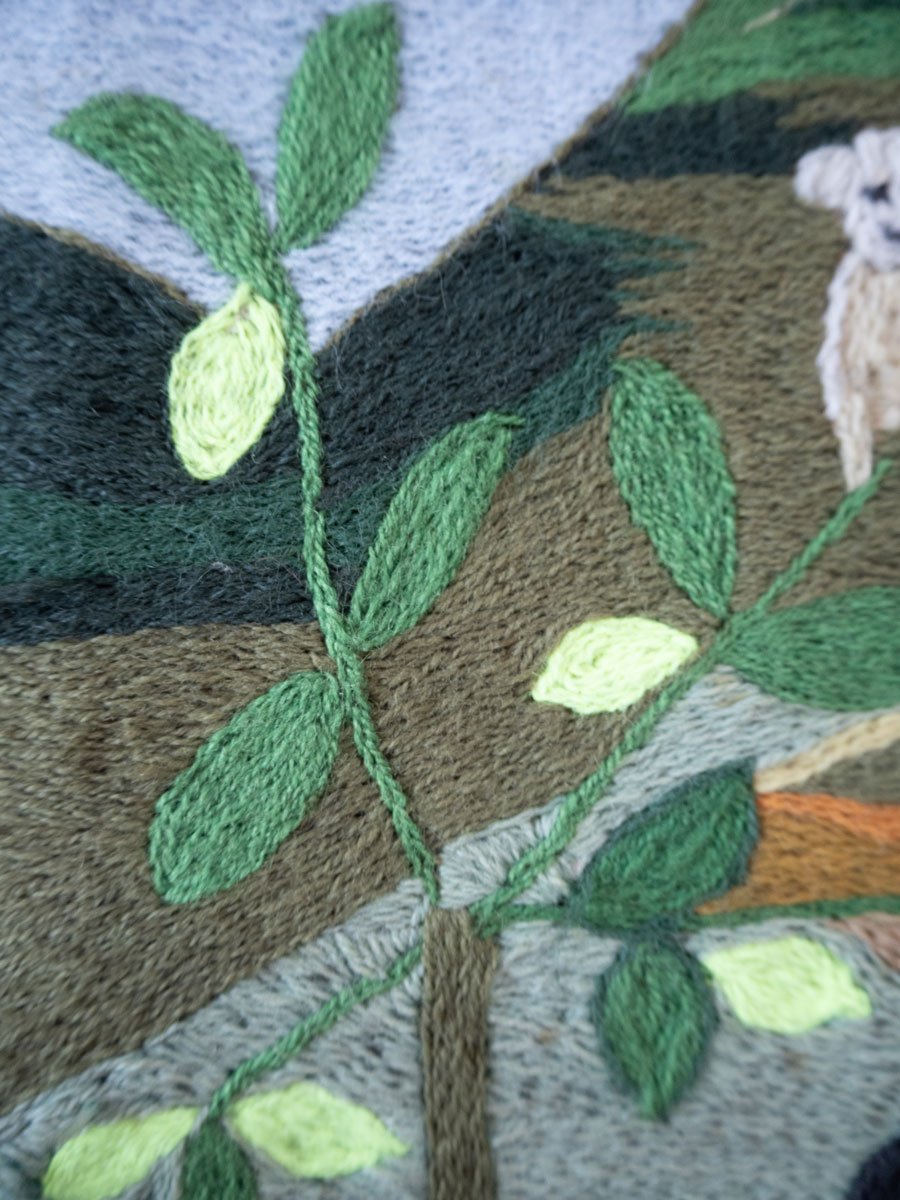 Fragmented Landscape (2024) weaves themes of memory, resistance, and intergenerational craftsmanship. In 1973, at the onset of Augusto Pinochet’s military dictatorship in Chile, my grandmother, Irma Pulgar Campos (1921–2004), created Doñihue, 1973—an arpillera, or embroidered textile scene. She was an art teacher in a rural school in central Chile. She asked her students to draw elements or motifs that represented the locality of Doñihue. There is the dog of one of the students, a Chamanto -traditional poncho worn by Chilean huasos-, the hills with their sheep and their soil of different colors, there is a Loica bird, a lemon tree, the huge summer tomatoes, an apple tree and an orange tree, and children playing and collecting the summer harvest.