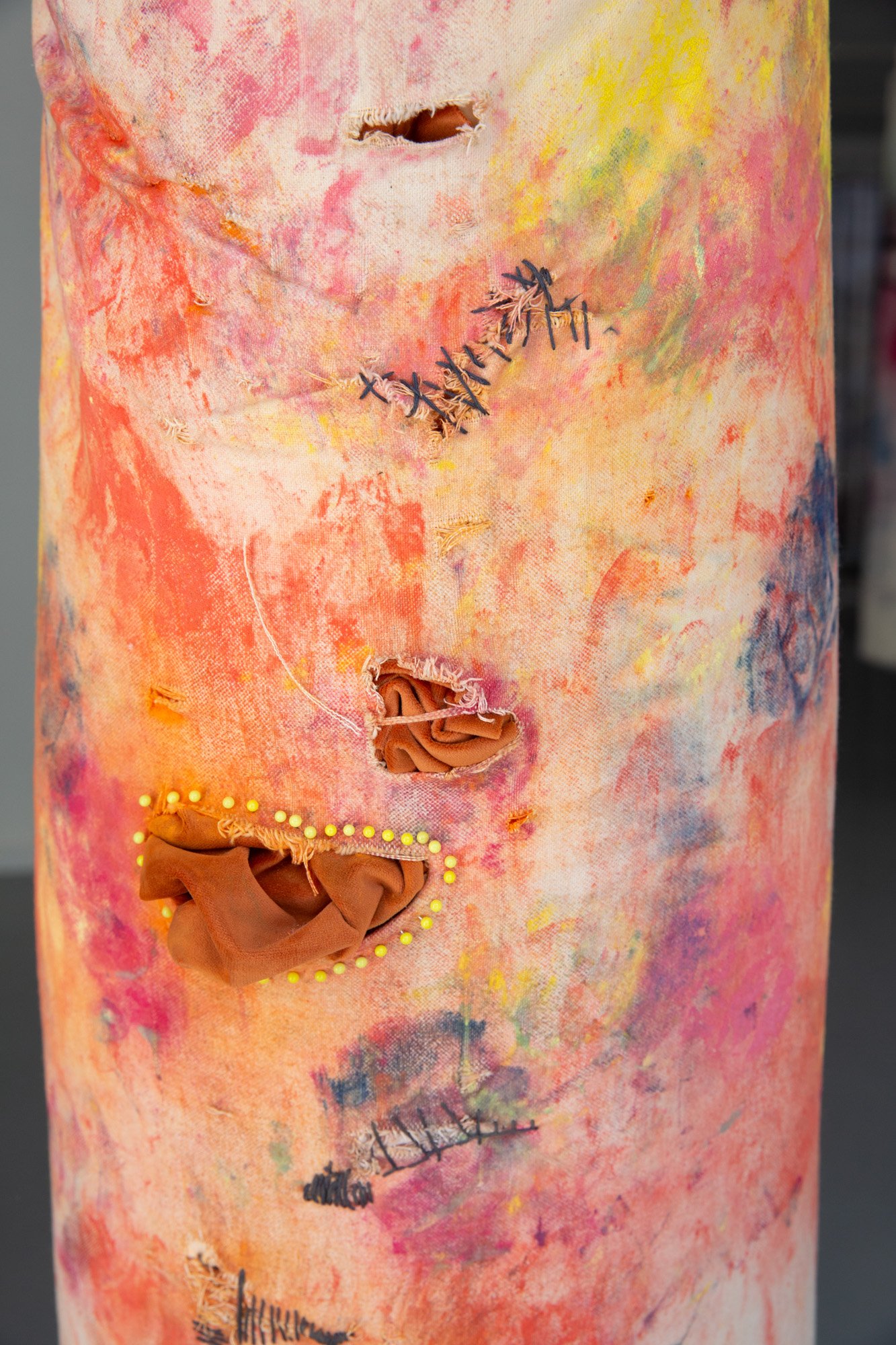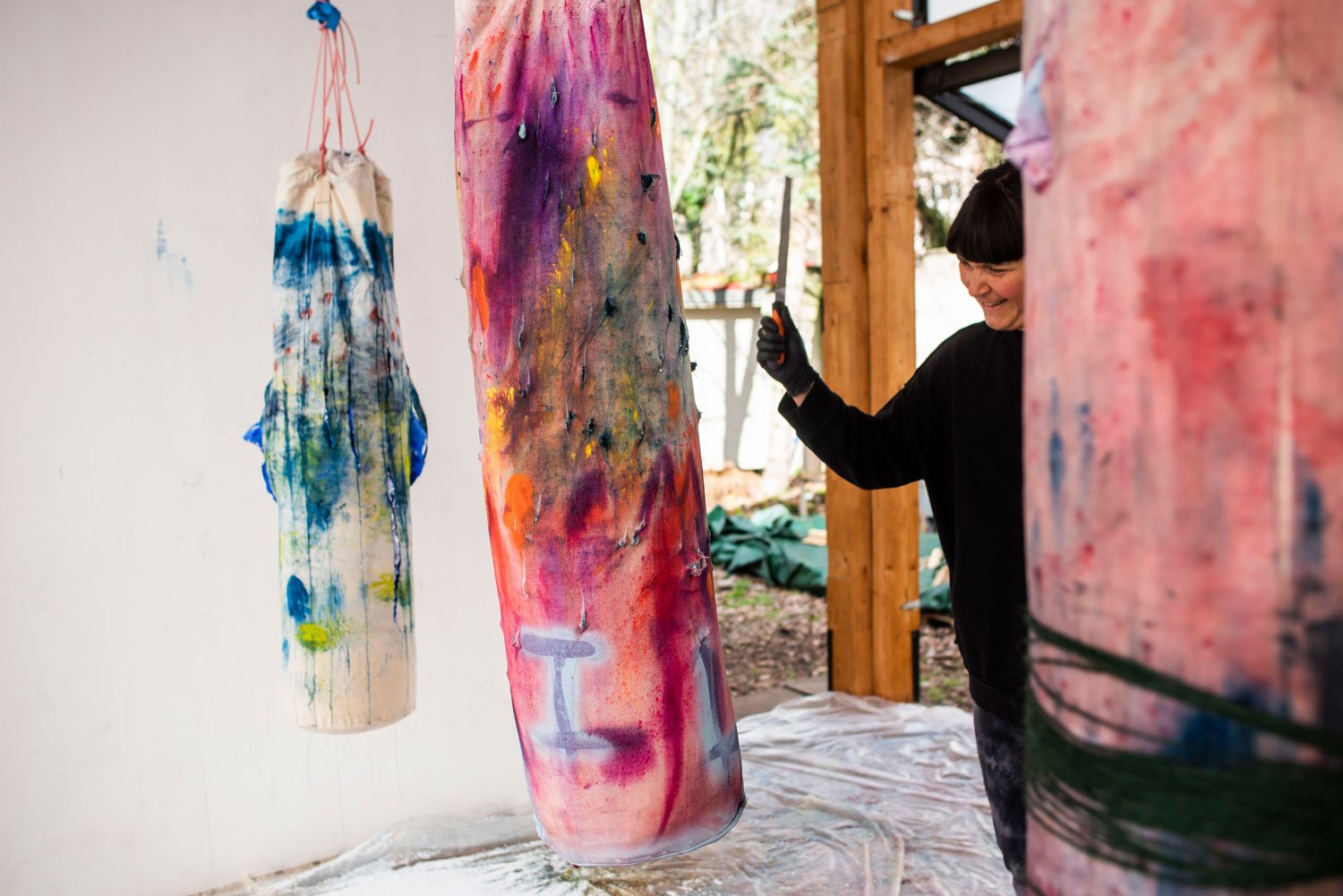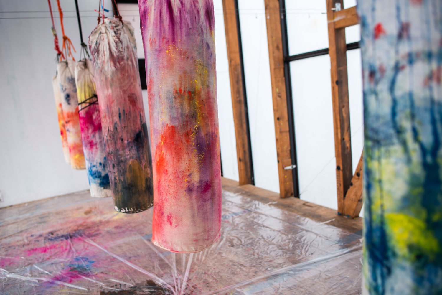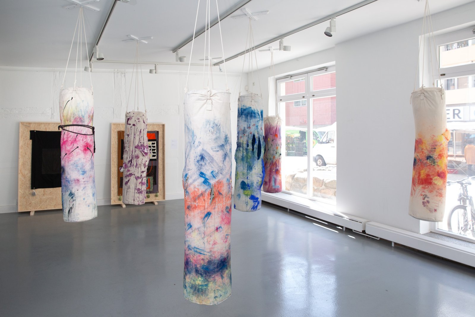 Boxing bags sewn from natural cotton canvas, thread, filling, pigments, cotton rope, leaf metal flakes, eyelets.