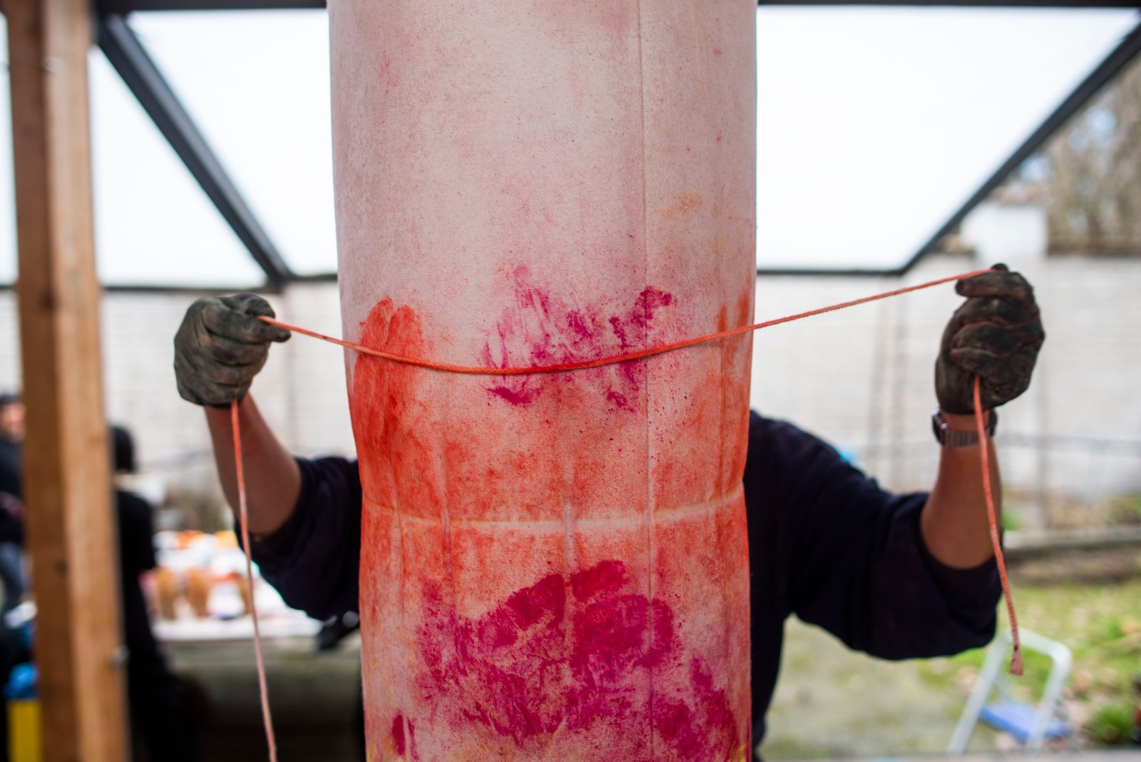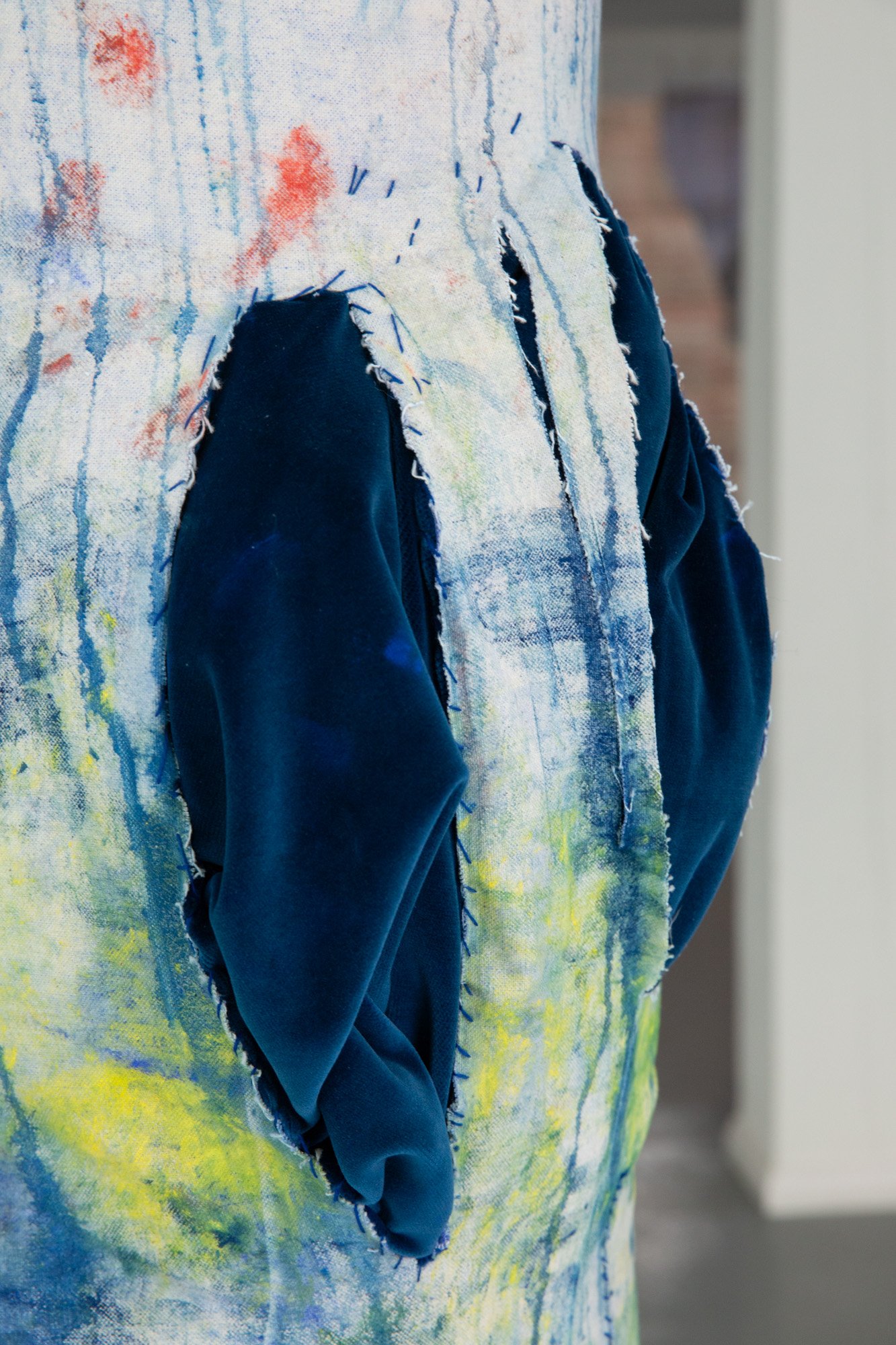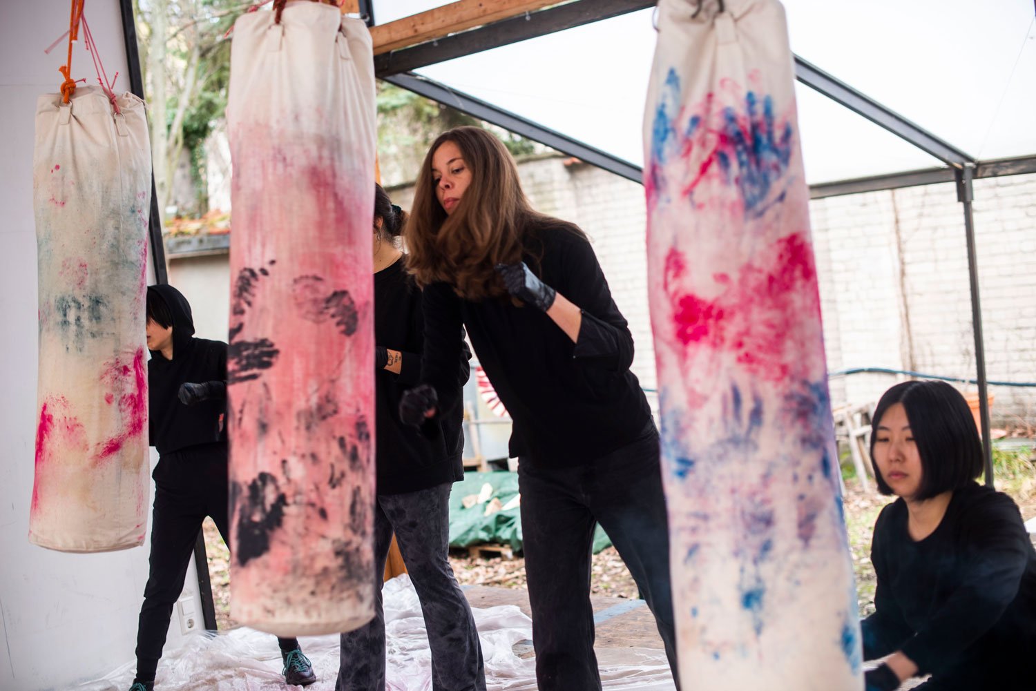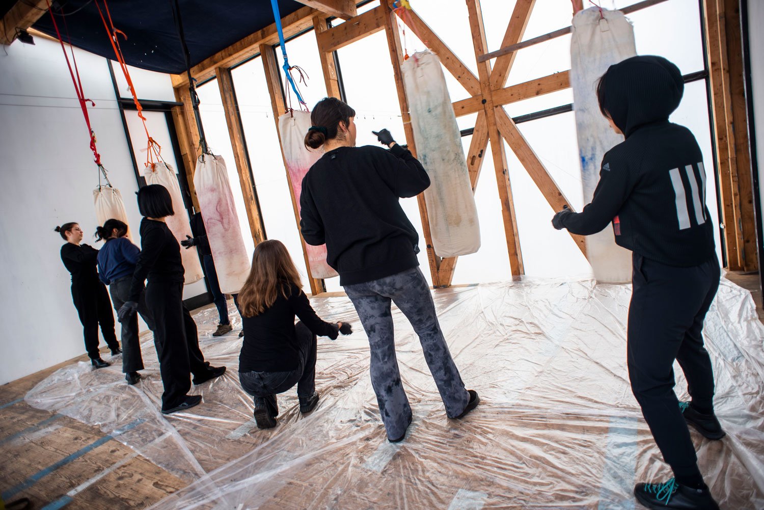 Boxing bags sewn from natural cotton canvas, thread, filling, pigments, cotton rope, leaf metal flakes, eyelets.