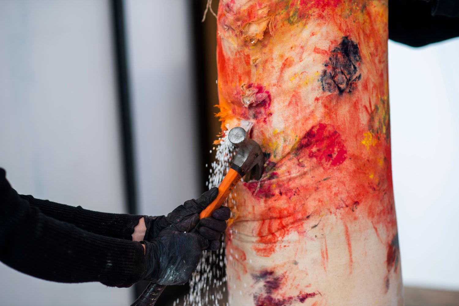 In a sort of frustration release ritual, the artists, through punches and tools, altered the bags. Later, the artist visibly mended the works, preparing them for exhibition. Visitors listen to their action through a sound component that captures the recorded destruction of the bags.