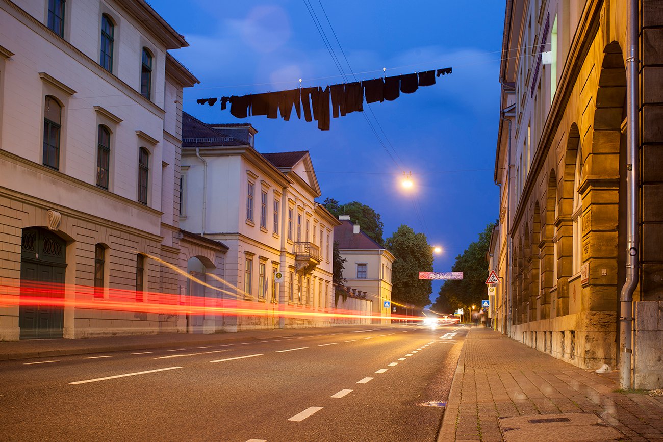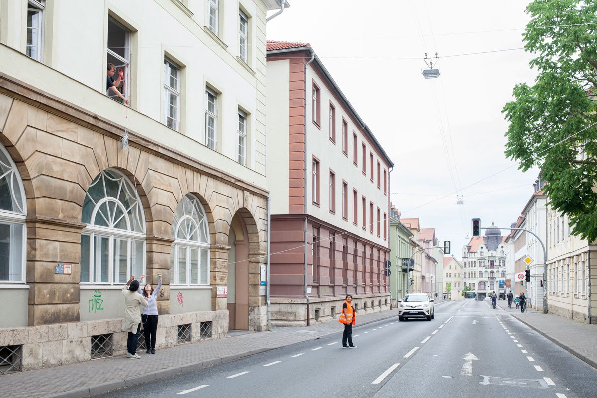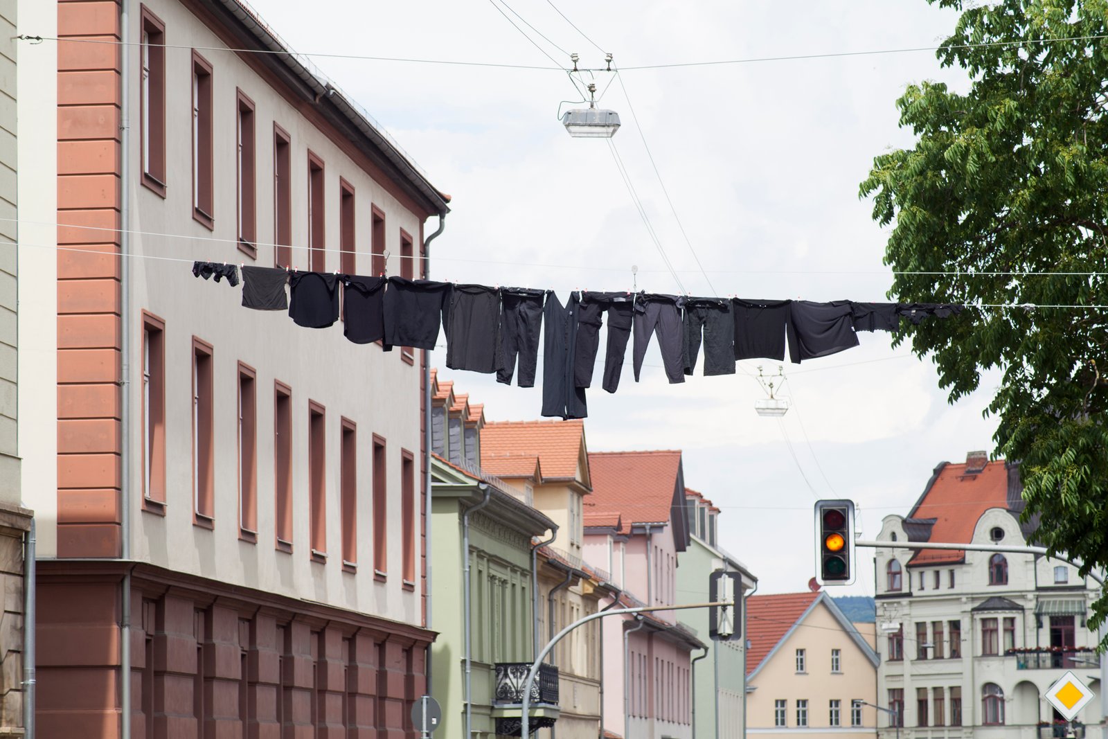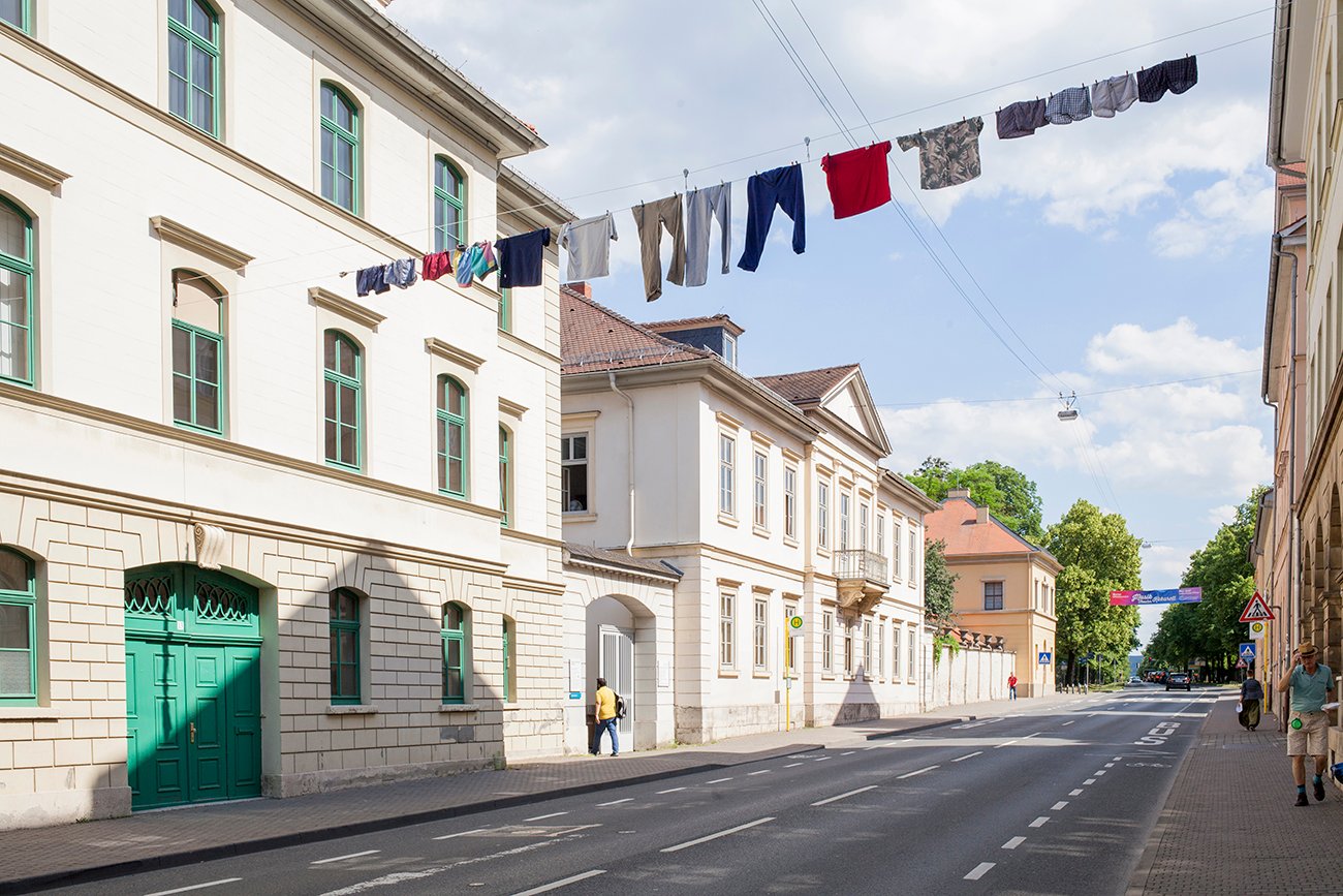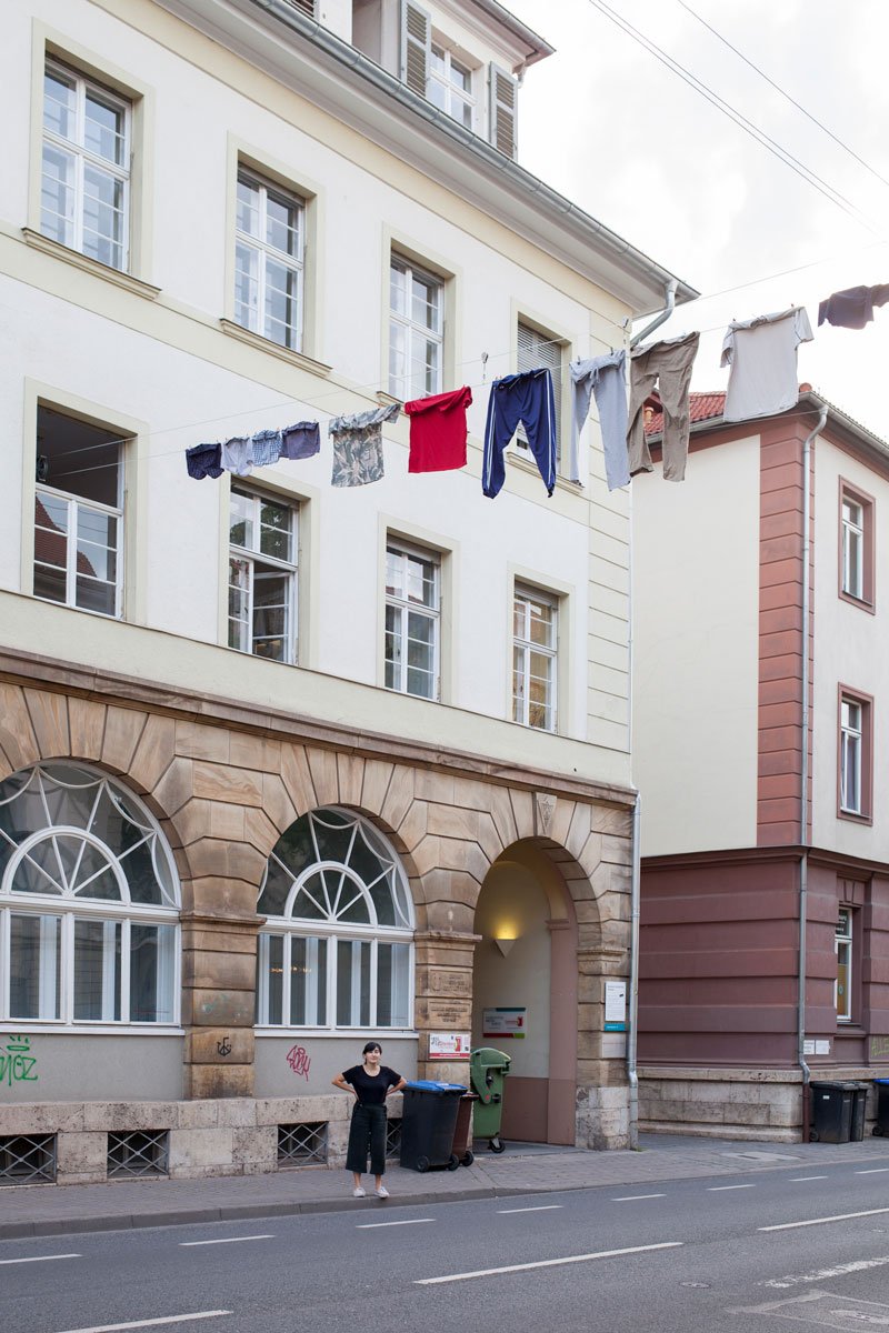 "One Line Portrait" is part of the research "Public Laundry, Hanging Territories". This project explores how the banal, when placed in a specific context, can become a symbolic expression of culture and its spatial-social practices. In June 2019, a clothesline was installed in the quiet cityscape of Weimar, portraying the presence of a different individual each day for one week.