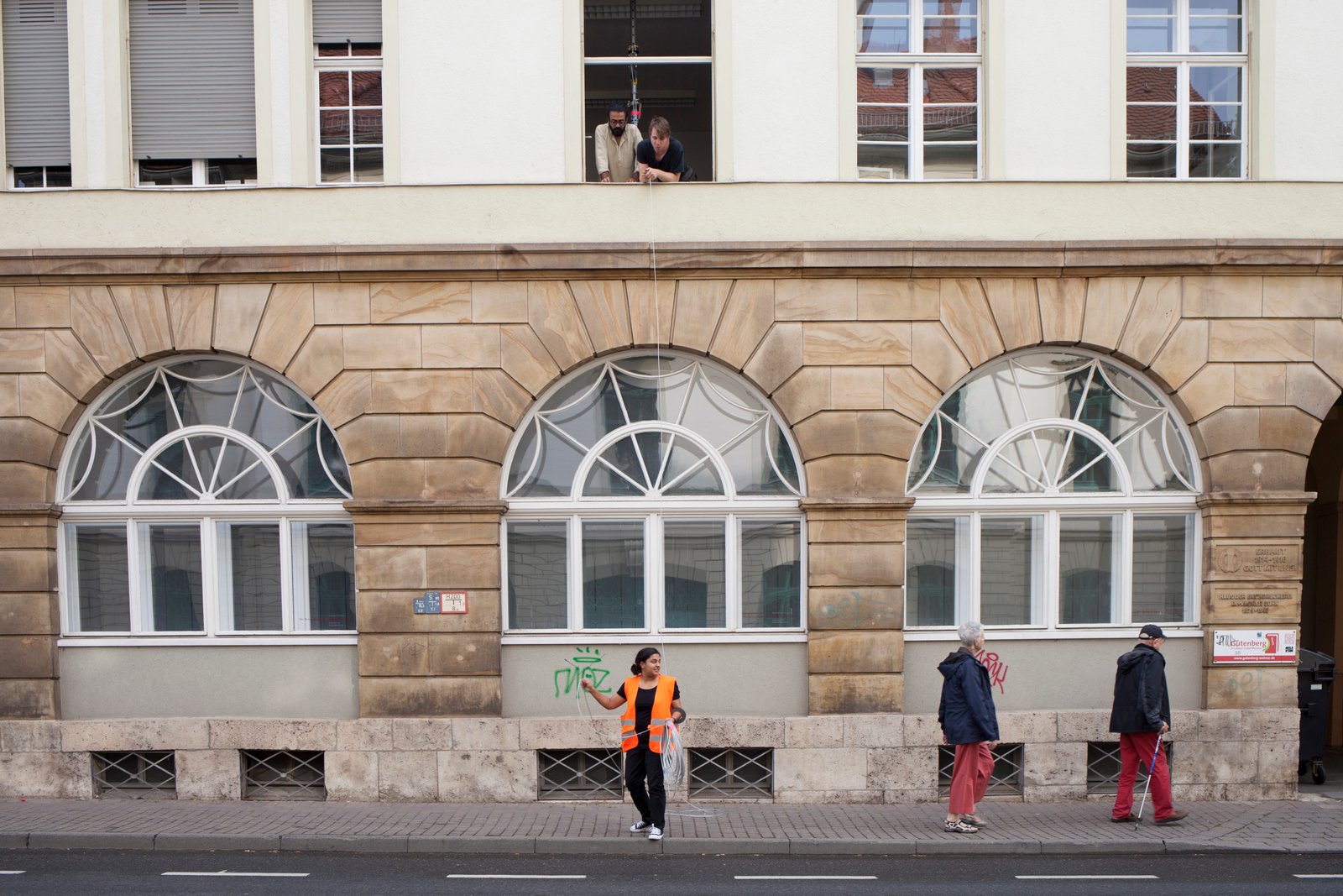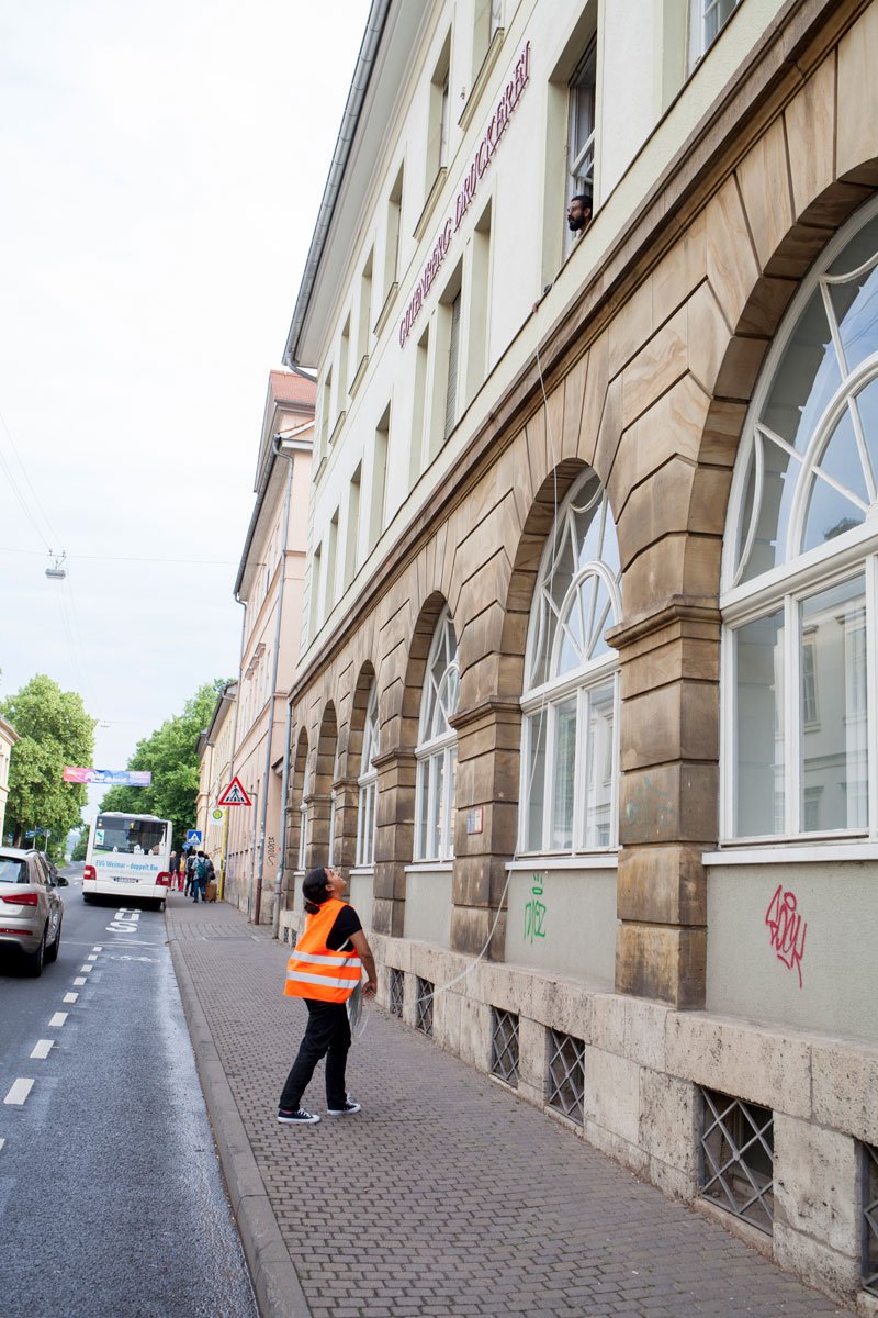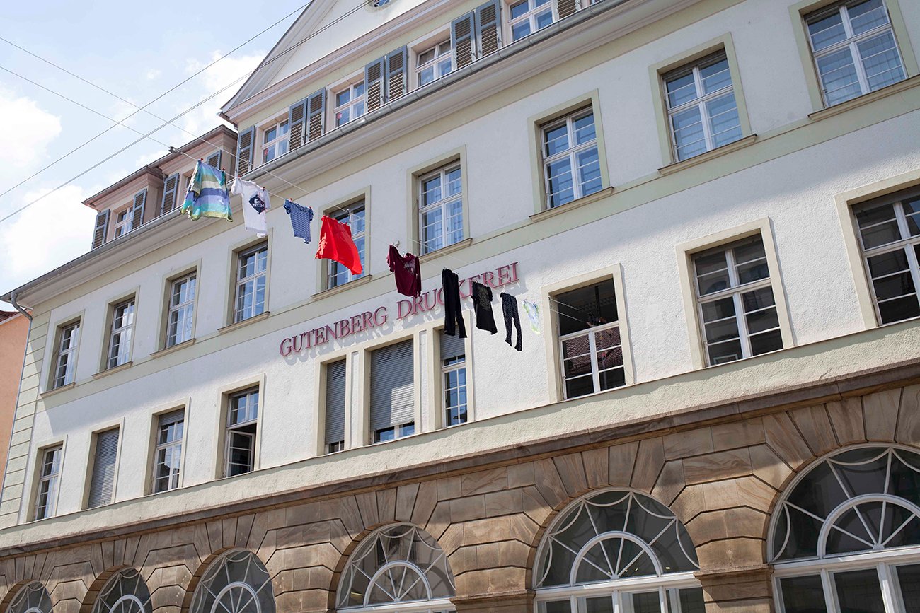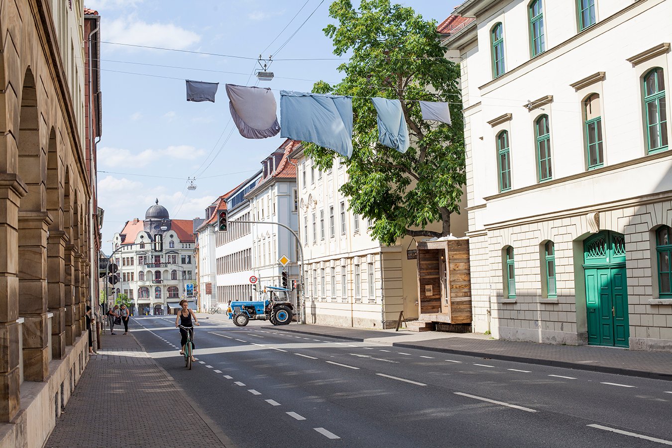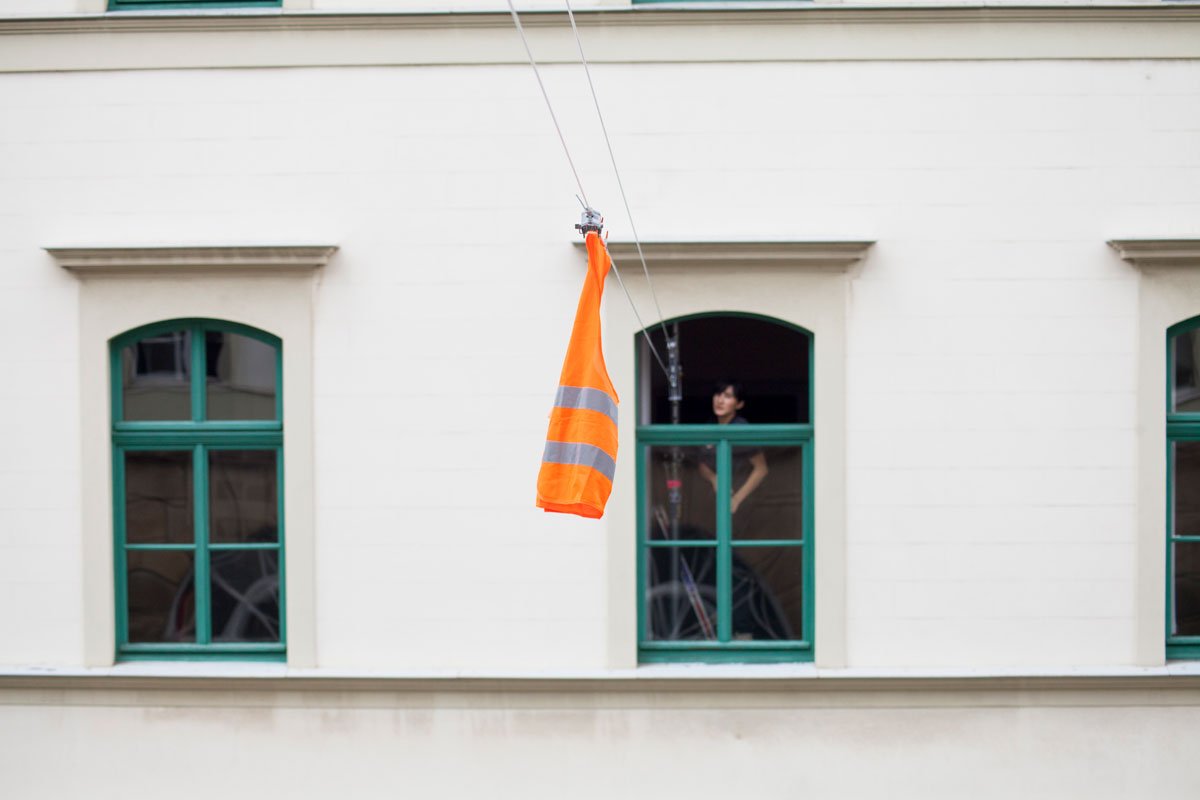 "One Line Portrait" is part of the research "Public Laundry, Hanging Territories". This project explores how the banal, when placed in a specific context, can become a symbolic expression of culture and its spatial-social practices. In June 2019, a clothesline was installed in the quiet cityscape of Weimar, portraying the presence of a different individual each day for one week.