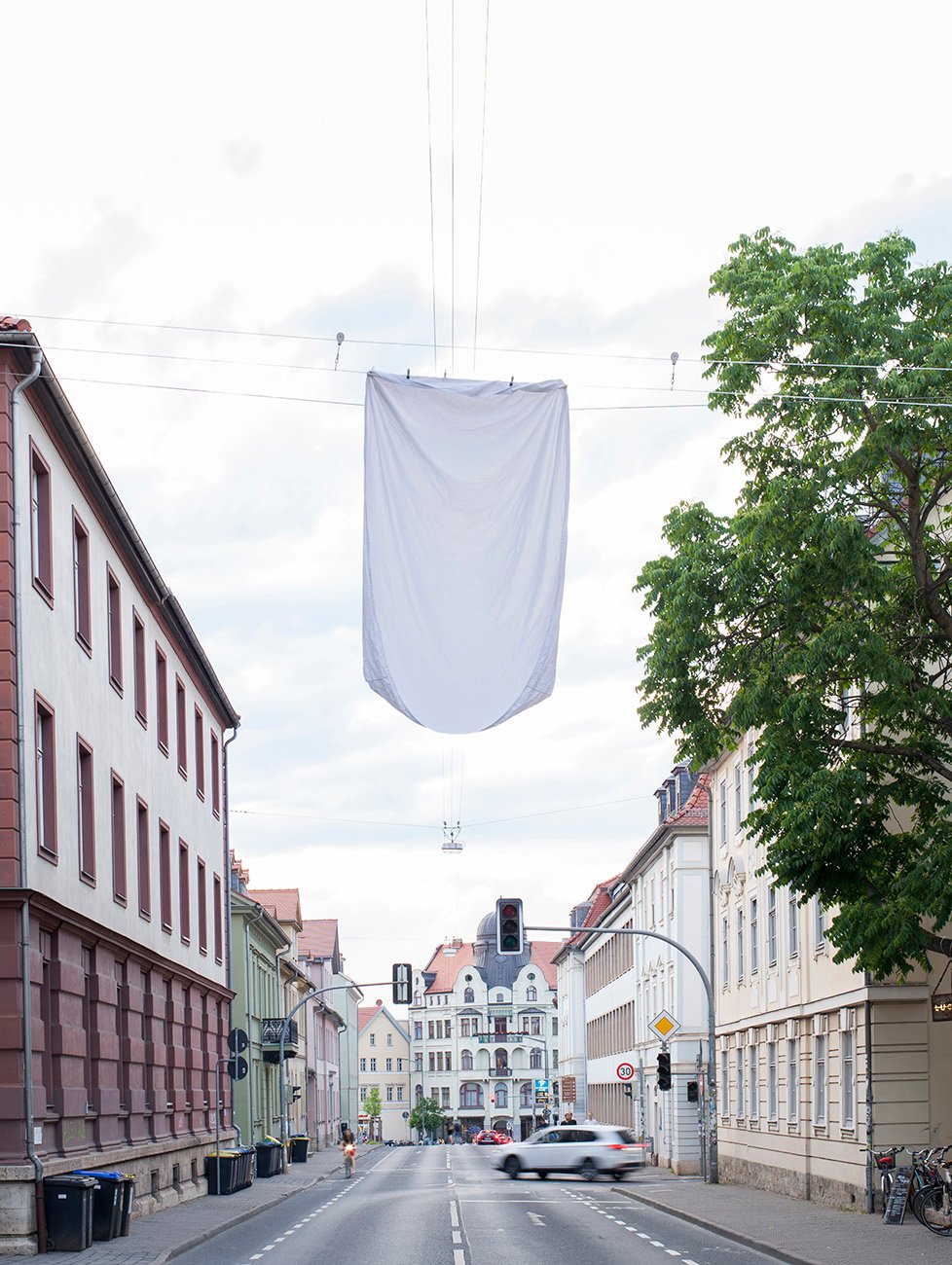 Suspended above a central street—where private and public life intersect—the clothesline acted like a flag, signaling an individual's presence within the public realm. By inserting this everyday object into the seemingly controlled urban environment, the work conveyed a sense of otherness and foreignness.