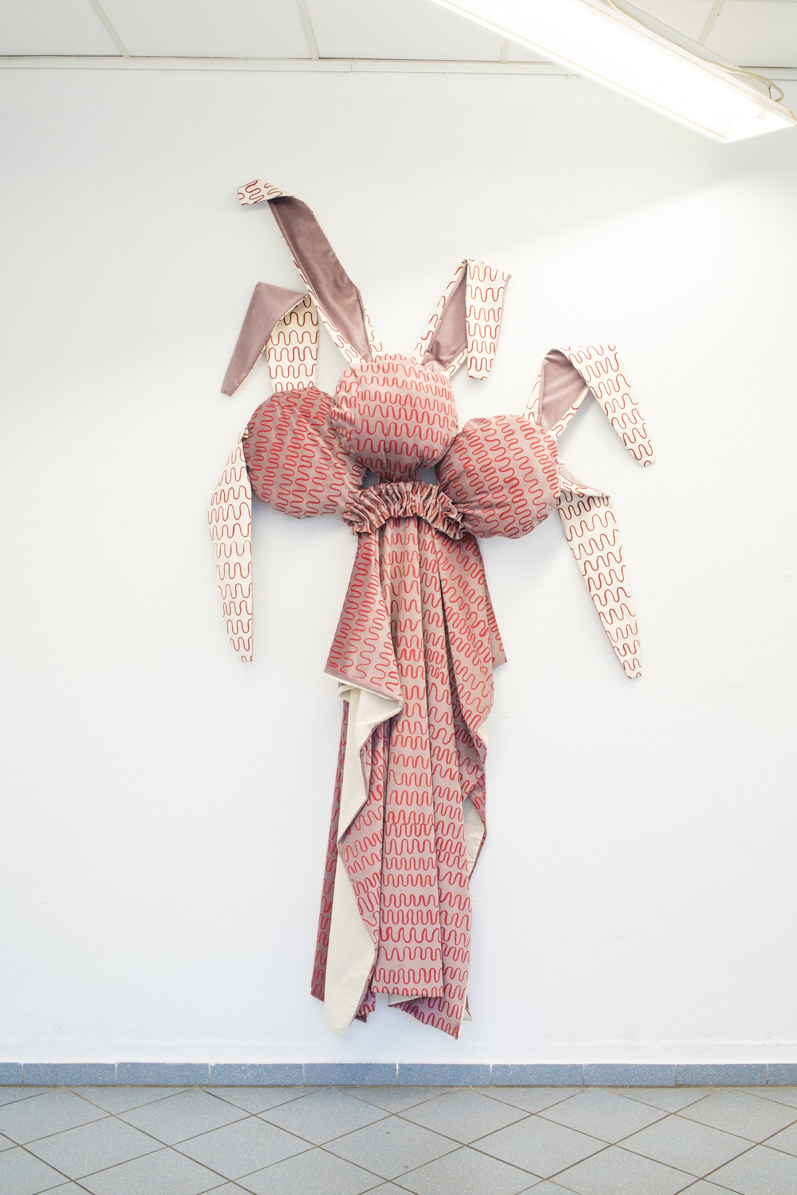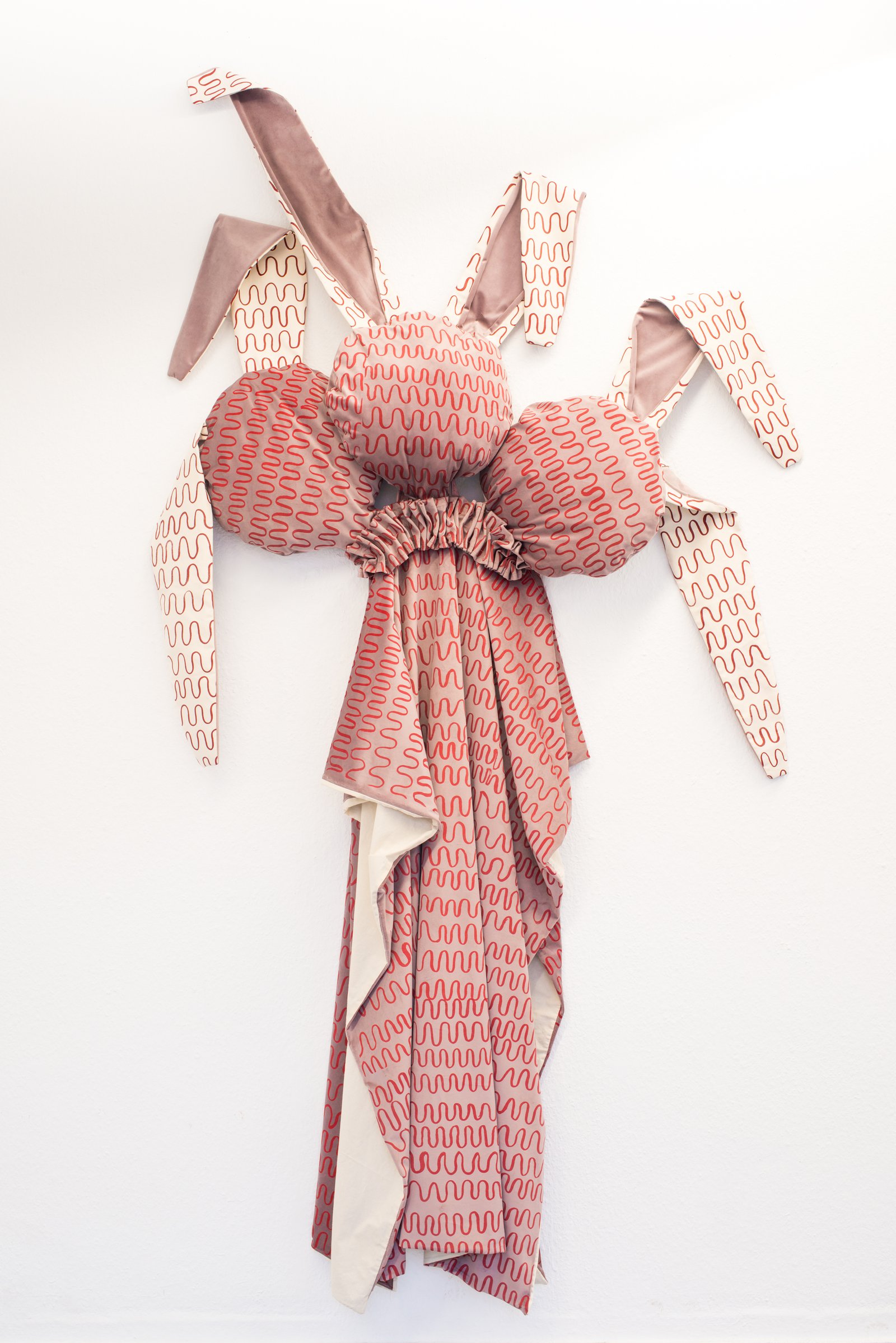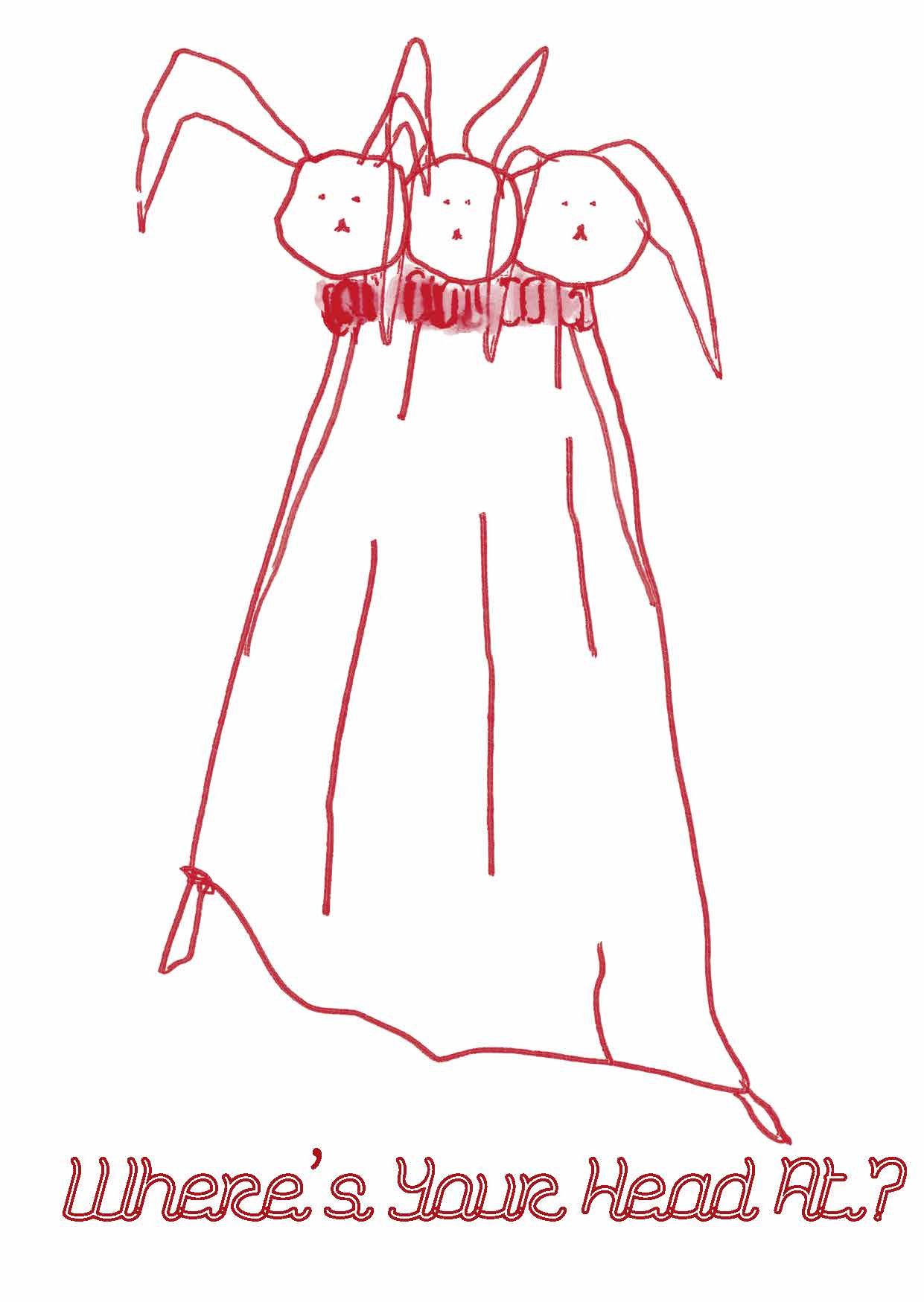 A large three-headed, bunny-shaped cuddle cloth Where’s Your Head At exists in dialogue with The Bad Mother (1997), a lithograph by Louise Bourgeois in which a three-headed mother stands with a milk dripping breast while a little girl clings to her leg. Created 8 months into the artist’s own journey of mothering and at the end of her maternity leave, the work reflects on a three-headed existence: career, economic security, and family life. It speaks to the first months of breastfeeding, getting to know a new baby, and the challenge of focusing on just one task: mothering.